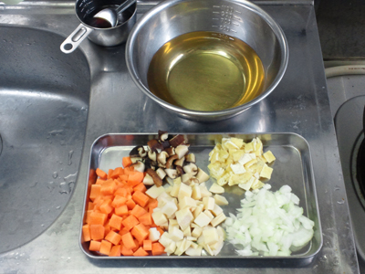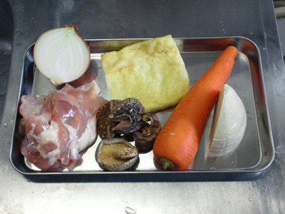油揚げ、にんじん、たけのこ、しいたけは、1cm角。
