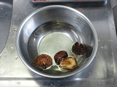 干ししいたけを水で戻します。もどし汁は後で使うので捨てないように。